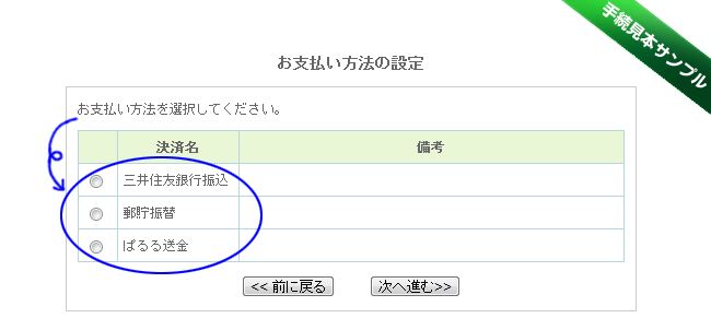| ●ご希望の支払い方法を選択し、「次へ進む」ボタンをクリックし、 「ご注文内容確認」画面へお進み下さい。 | |||